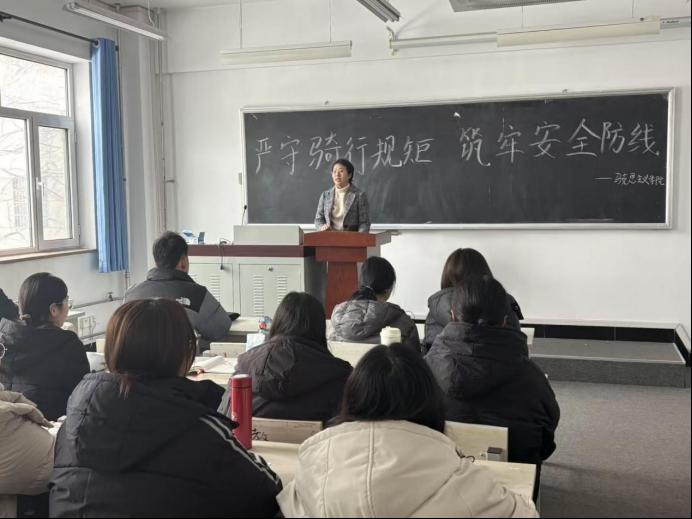会上,党总支副书记董怀晶围绕校园电动车骑行规范、交通安全法规、风险隐患防范等内容展开讲解。她结合典型安全案例,深入剖析了电动车超速行驶、不佩戴安全头盔、违规载人载物、乱停乱放、违规充电等行为的严重危害,提醒同学们时刻绷紧安全之弦,摒弃侥幸心理,严守交通规则与校园管理规定。会议强调,安全出行是对自己负责、对他人负责、对社会负责,青年学生要自觉养成文明骑行、规范停放的良好习惯,把安全意识转化为日常行动,共同维护平安有序的校园环境。