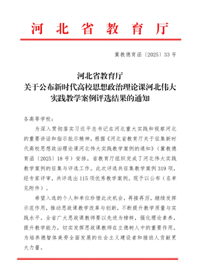 威廉希尔高度重视思想政治理论课建设,始终把提升思政课教学质量与育人实效作为核心任务,积极鼓励教师深入地方一线开展调研实践,挖掘河北红色资源、发展成就、先进典型等鲜活教学素材,推动思政课从“课堂讲授” 向 “实践育人” 延伸,从 “理论灌输” 向 “价值引领” 转型。此次入选省级优秀教学案例,既是学院思政课教学改革成果的集中体现,也为后续教学工作提供了宝贵的示范经验。未来,学院将以此次获奖为契机,进一步加强思政课教学团队建设,持续深化教学改革创新,不断丰富实践教学内容与形式,着力打造更多高质量的思政教学案例,让思政课真正成为学生喜闻乐见、终身受益的“金课”,为培养担当民族复兴大任的时代新人贡献更大力量。