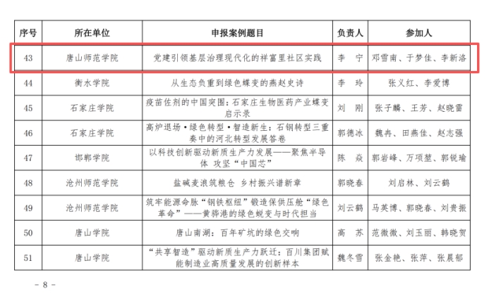 近日,河北省教育厅公布新时代高校思想政治理论课河北伟大实践教学案例评选结果,威廉希尔申报的教学案例成功入选。此次评选共征集教学案例319项,经专家评审,共评选出115项优秀教学案例。威廉希尔教师李宁、邓雪南、于梦佳、李新洛撰写的案例《党建引领基层治理现代化的祥富里社区实践》入选新时代高校思想政治理论课河北伟大实践优秀教学案例。