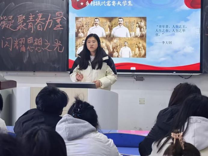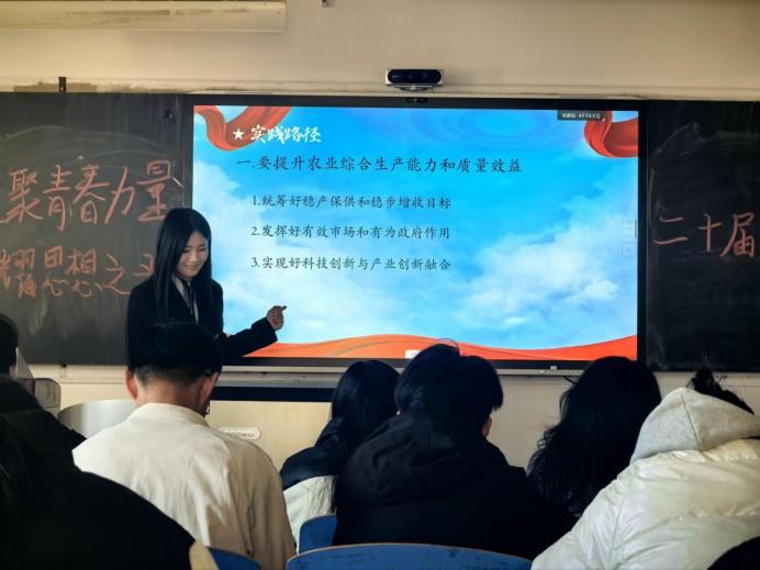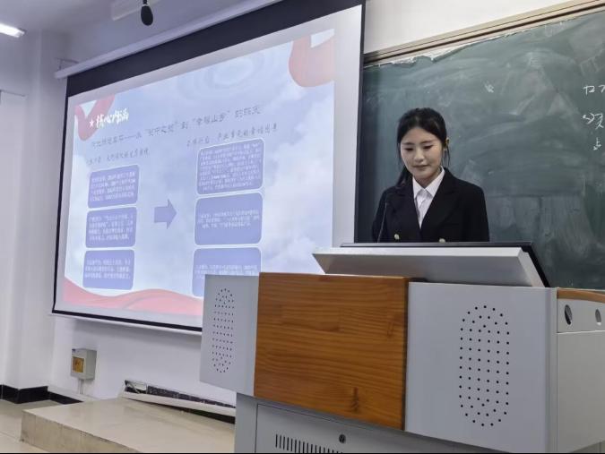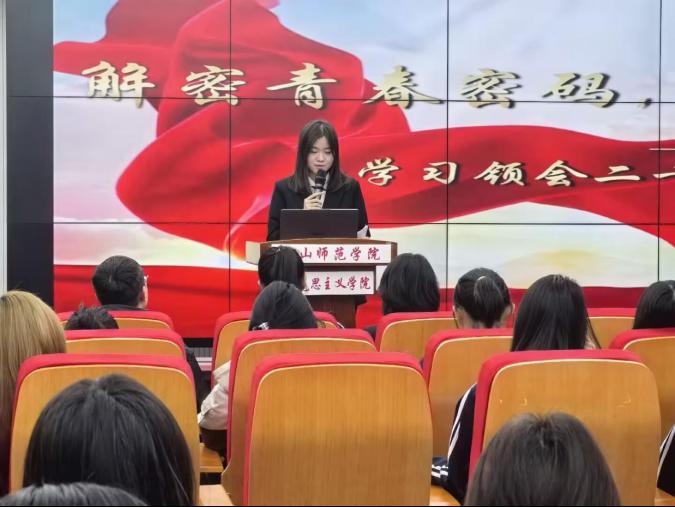 宣讲活动在庄严有序的氛围中展开,三位主讲人依次登台,依托各自核心内容,围绕全会精神形成层层递进的解读体系。2025级思想政治教育本科二班顾芯萌聚焦全会基本信息与核心部署,系统梳理全会召开的时代背景与重大意义,帮助在场学子明晰“十五五”规划与国家发展全局的紧密关联;2025级思想政治教育本科一班翟奕霏以国家安全体系和能力现代化为核心,阐释新时代维护国家主权、安全、发展利益的战略要求,传递“统筹发展与安全”的重要理念;2025级学前教育本科二班韩盼盼则结合乡村振兴与农业农村现代化主题,展现全会精神在“三农”领域的实践方向,激发学子关注基层、服务乡村的热情。