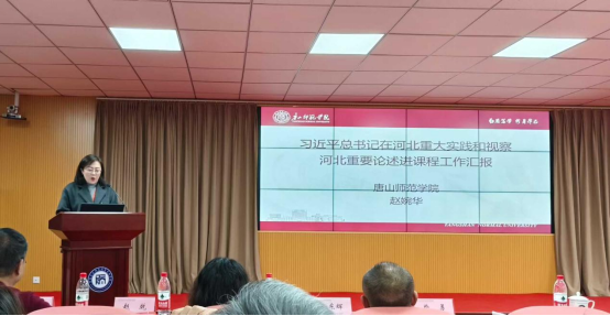 赵婉华副院长代表唐山师范学院作专题工作汇报,重点介绍了习近平总书记在河北重大实践和视察河北重要论述研修基地(唐山师范学院) 的建设与运行情况。她从研修基地的师资队伍建设、研修课程体系开发、实践教学活动开展等方面进行了详细阐述,展现了基地在深入研究、宣传阐释习近平总书记重要论述方面所做的扎实工作。同时,赵婉华副院长还围绕学校推动习近平总书记在河北重大实践和视察河北重要论述进课程教材的具体举措、教学成效及未来规划进行了汇报,分享了唐山师范学院将理论知识与河北本土实践相结合,打造具有地方特色的马克思主义理论教学体系的实践经验。